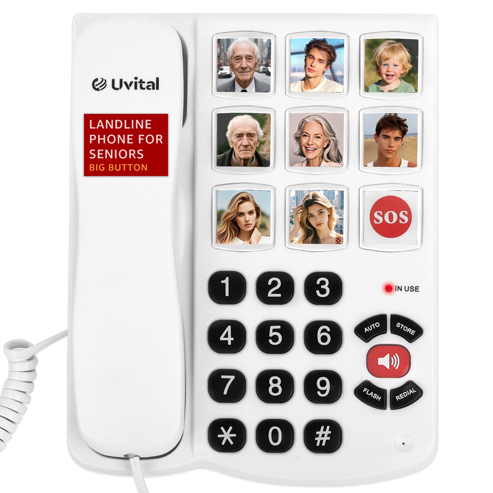 Uvital Big Button Phone for Seniors, Corded Landline Phone with 9 One-Touch Dialing Big Buttons, Hands-Free Calling, Loud Ringer, Telephone for Seniors, White